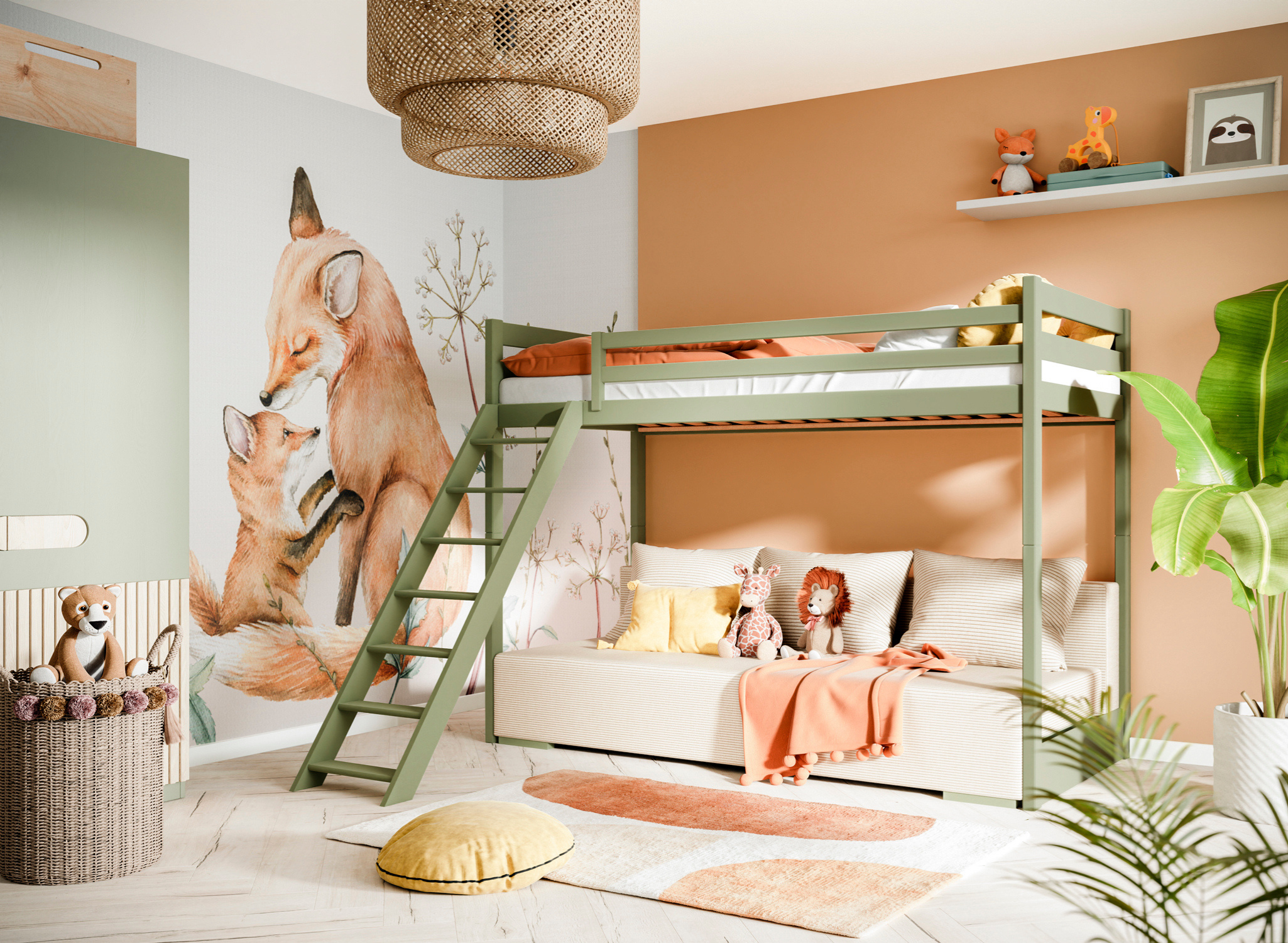 Olivový patrová dětské vyvýšené postele s pohovkou SOFINO 90x200/140x200 vás okouzlí svým neotřelým spojením