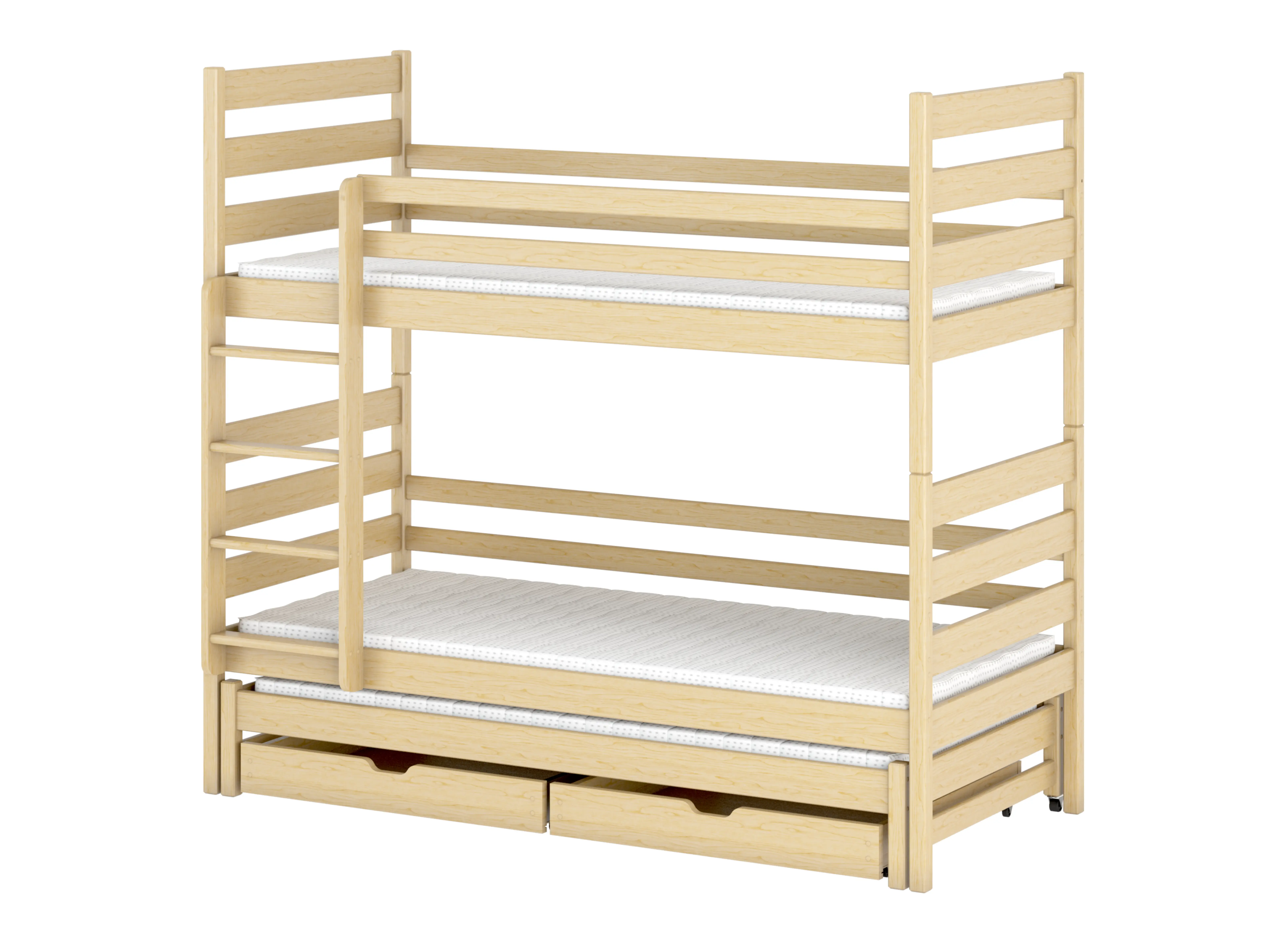 V Lano Meble se staráme o bezpečnost vašeho dítěte, proto jsou všechna naše dětská lůžka vyráběna s dodržením nejvyšších standardů. Rám patrové postele TOMI je vyroben z borovicového dřeva a pokrytý vodou ředitelnou barvou, která je trvanlivá a splňuje všechny normy týkající se ochrany zdraví. Navíc univerzální vzhled nábytku umožňuje snadné začlenění do interiérového designu a proměnu dětského pokoje v útulnou dětskou ložnici. Patrová postel TOMI může být zajímavou volbou jak pro dvojčata, tak pro sourozence podobného věku. Patrovou postel TOMI od Lano Meble můžete přizpůsobit svým individuálním požadavkům. Postel nabízí až 3 místa na spaní, takže si můžete vybrat horní a spodní matraci a matraci na výsuvný podklad. Pokud vaše děti nebudou chtít využívat patrovou postel TOMI, můžete ji kdykoli rozdělit na dvě samostatná lůžka.
