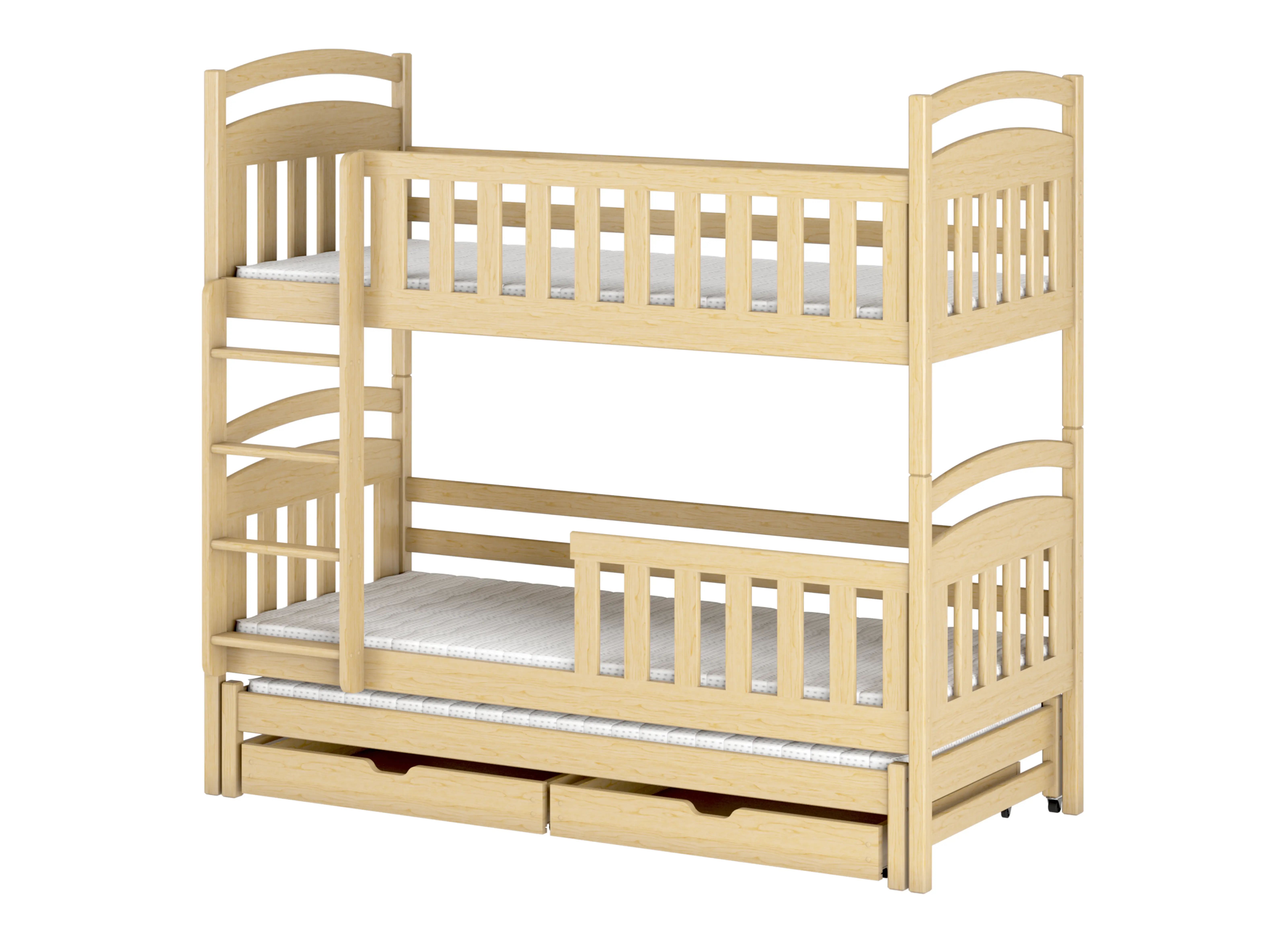 Patrové lůžko VIKI je vyrobeno z borovicového dřeva. Tento materiál je trvanlivý, odolný proti mechanickému poškození a vysokému zatížení. Konstrukce lůžka pro sourozence VIKI je tedy nesmírně pevná. Kromě toho je to postel se zásuvkami, které poskytují další úložný prostor například pro ložní prádlo nebo hračky.