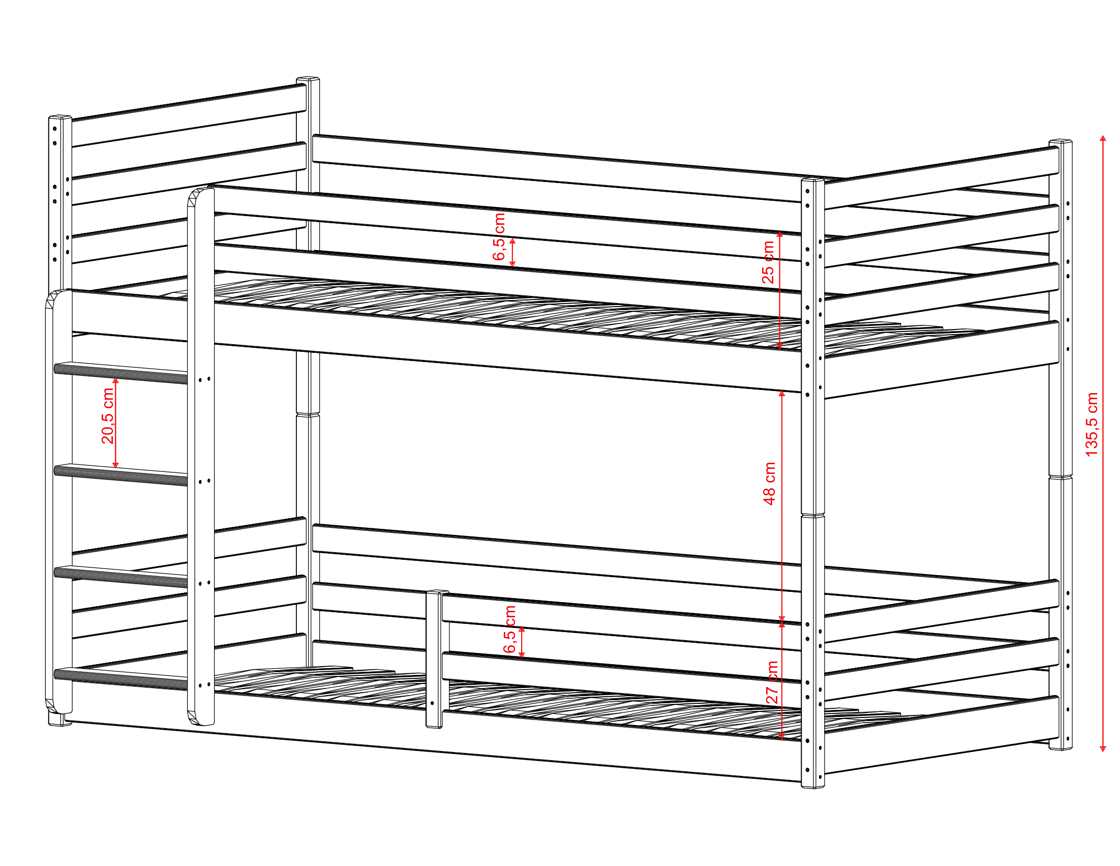 MINI patrová postel je kus nábytku, který byl vyvinut na základě zkušeností a postřehů nejmenších dětí. Díky tomu se nám podařilo vytvořit řešení, které je extrémně pohodlné, bezpečné , a zároveň svým stylem zapadne do rámce mnoha aranžmá. Nechybí ani možnost montáže žebříku na stranu, díky čemuž MINI patrová postel bude vynikající volbou bez ohledu na velikost a tvar dětský pokoj . Nečekejte, ke skupině spokojených zákazníků se můžete přidat již nyní Lano Meble . Dvě děti to je doma určitě velká radost! Vždy však musíte v takovém případě myslet na funkční řešení, která ušetří místo. MINI patrová postel dokonale splňuje tato očekávání! Takový nábytek je splněným snem každého dítěte. Podívejte se, co vás ještě překvapí. Konstrukce MINI patrová postel sestává z vyrobeno z borovicového dřeva , což je velmi pevný materiál . Jedná se o řešení, které jistě osloví každé dítě bez ohledu na věk či pohlaví. Dokonalé proporce postele a propracované zpracování zaručují pohodlný, klidný a hluboký spánek pro dvě děti .