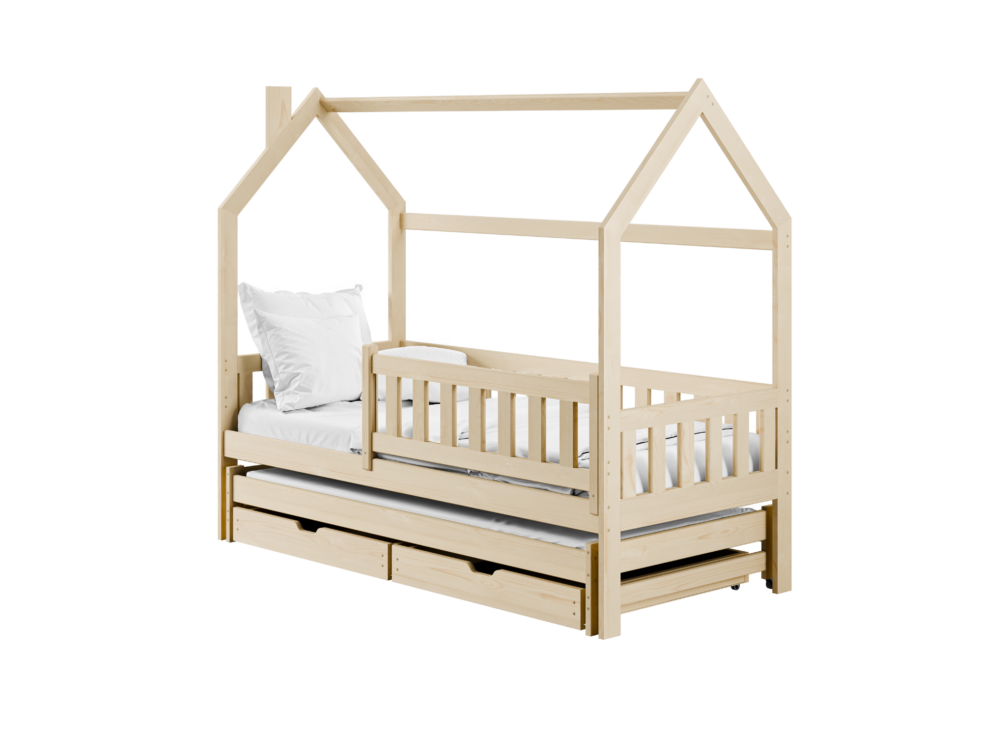 Dětská postel domeček MONKEY je návrh, který nadchne všechny malé děti. Je to jedinečný nábytek, který nejen že zaujme svým roztomilým vzhledem ve tvaru domečku, ale také funkčností a komfortem, který nabízí. Dětská postel domeček MONKEY má pro každého něco. Je vyrobena z pevných borovicových desek, které jsou navíc chráněny neutrálními laky, které jsou bezpečné pro zdraví. Dřevo je také materiál s antistatickými vlastnostmi, což jistě ocení alergici. Styl dětské postele domeček MONKEY díky jednoduchému tvaru a klasickým liniím zapadne do každého dětského pokoje. Je třeba zdůraznit, že dětská postel domeček MONKEY není jen krásný design v pohádkovém stylu. Je to také velmi praktický nábytek. Vysouvací část umožňuje ušetřit spoustu místa během dne, jednoduše zasunutím druhého lůžka. A to není vše. Dětská postel domeček MONKEY má také praktické, prostorné zásuvky, které můžete použít k uložení hraček, ložního prádla, oblečení nebo čehokoli, co potřebujete. Jaká úspora místa!