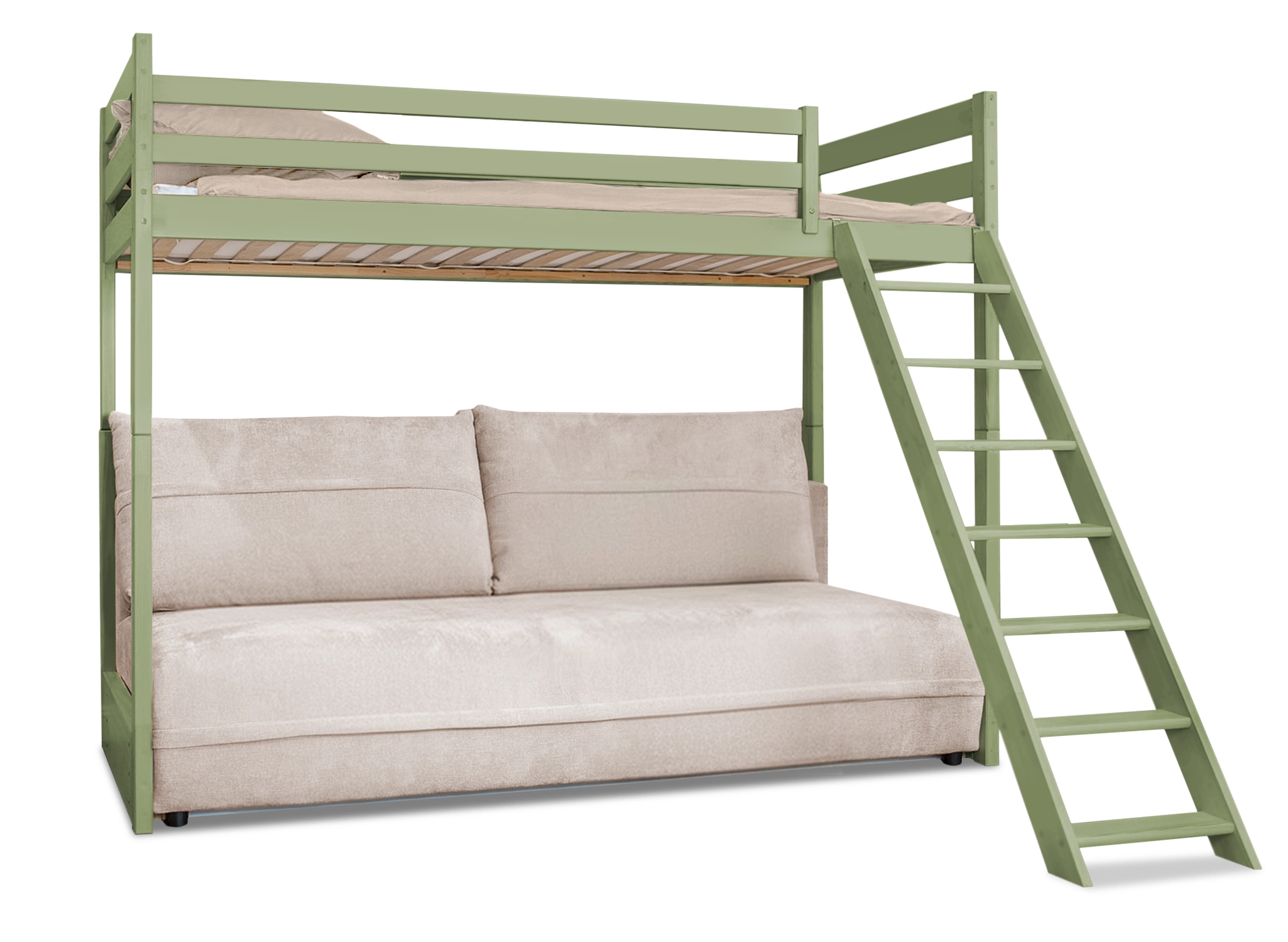 Olivová patrová postel na patře s pohovkou SAVIO 90x200/140x200 vás ohromí svou neobvyklou kombinací