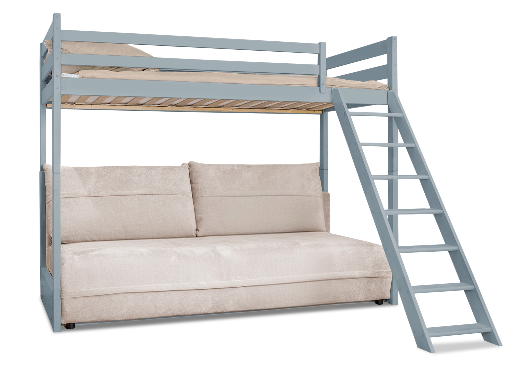 Popelavě šedá patrová postel na patře s pohovkou SAVIO 90x200/140x200 vás ohromí svou neobvyklou kombinací